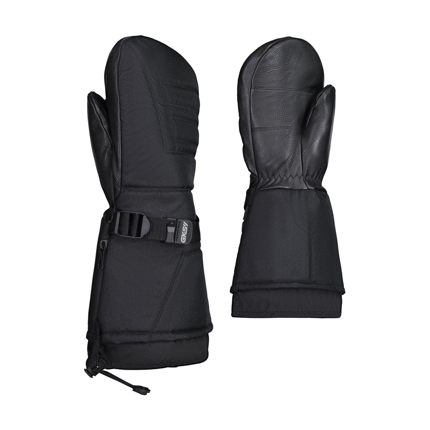 Mitaine en cuir de chevreuil, avec le dos de la main en nylon et une doublure détachable en flanelle et Thinsulate. Elle dispose d'une courroie ajustable au poignet et d'un système aidant à prévenir l'infiltration de la neige au bout de la longue manchette en nylon.