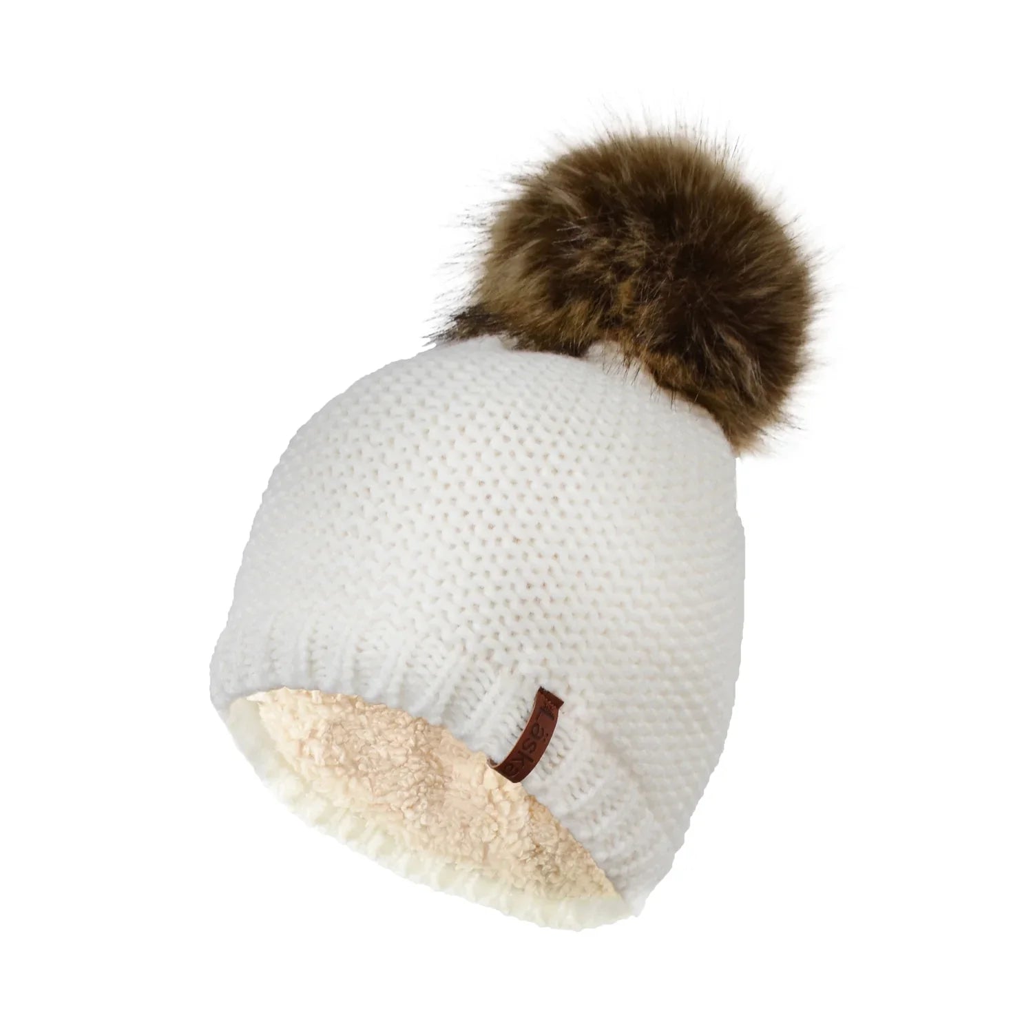 Tuque en tricot acrylique, ornée d’un pompon de fourrure synthétique. Elle est doublée de peluche épaisse afin d'apporter chaleur et confort.